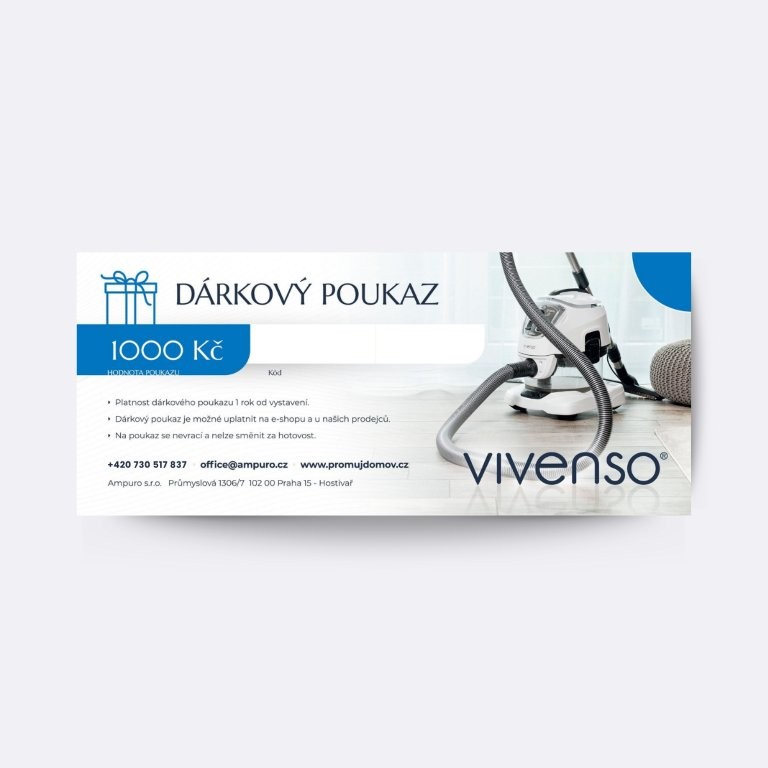 Věnujte svým blízkým dárkový poukaz v hodnotě 1 000 Kč a vykouzlete jim úsměv na tváři! Dárkový poukaz lze použít na celý sortiment našeho e-shopu a také u našich prodejců. Využijte dárkový poukaz např. na koupi vodního vysavače Vivenso anebo jeho příslušenství.
